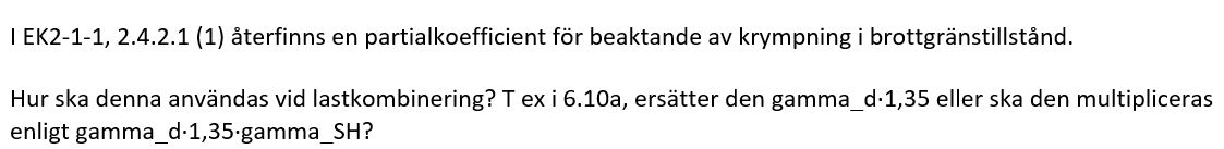 Fråga: Hur skall andra ordningens moment beräknas i bruksgränstillståndet för pelare/väggar? Om man väljer styvhetsmetoden ska man då beräkna enligt ekvation 5.28 men med styvheten EI beräknad på vanligt sätt med hänsyn till krypning och uppsprickning? Ekvation 5.21 gäller väl bara för brottgränstillståndet? Hur gör man i bruksgränstillståndet om man väljer krökningsmetoden? I brottgränstillståndet används dimensioneringsvärdet på töjningen vid krökningsberäkningen men om man då i bruksgränstillståndet använder det karakteristiska värdet på töjningen blir ofta krökningen större i bruksgränstillståndet än i brottgränstillståndet, även om man tar hänsyn till skillnaden i normalkraftens storlek. Detta verkar inte rimligt.