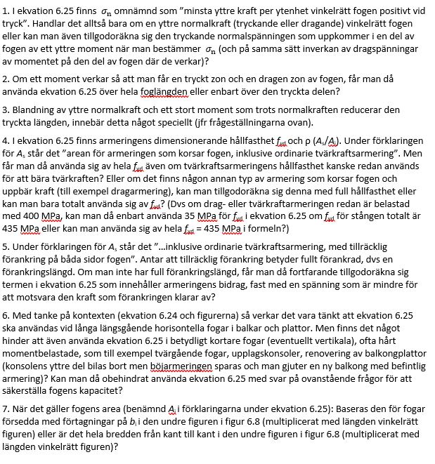 Fråga: Min fråga gäller tvärkraftsbrottmoden hävstångsbrott i betong, kapitel 7.2.2.4. För brottmoderna betongkonsbrott (7.21.4) och betongkantbrott (7.2.2.5) ges möjlighet att höja bärförmågan genom att lägga in kompletterande armering. Kontroll av betongen utgår då och ersätts av kontroller av den kompletterande armeringen. Ingen sådan möjlighet att armera mot brottmoden verkar finnas för hävstångsbrott i betong. Bärförmågan reduceras i stället vid förekomst av armering. Dels genom faktorn 0,75 i ekvation 7.39b vid förekomst av kompletterande armering och dels möjligen vid förekomst av ytarmering genom faktorn Ψre,N i beräkningen av NRk,c. Är detta rätt uppfattat? Och är det i så fall inte märkligt att bärförmågan med hänsyn till hävstångsbrott i betong beror av bärförmågan med hänsyn till betongkonsbrott, men att armering som i praktiken höjer bärförmågan med hänsyn till betongkonsbrott sänker bärförmågan med hänsyn till hävstångsbrott i betong? Är det möjligt att NRk,c.i ekv. 7.39b egentligen skulle ersättas med en bärförmåga relaterad till den kompletterande armeringen? Borde inte armering rätvinkligt mot ytan höja bärförmågan? Den höjer ju i praktiken bärförmågan med hänsyn till betongkonsbrott, och bärförmågan med hänsyn till hävstångsbrott i betong är ju beroende av denna.