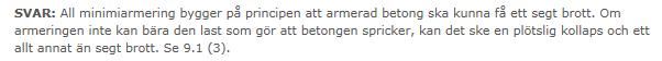 Om det är rätt så är ju exemplet ganska extremt, och i ett sådant fall kan man kanske påvisa att de dragspänningar som behövs för jämvikt ligger under draghållfastheten för oarmerad betong enligt kapitel 12 och EKS, och då kan man undvara minimiarmering.
