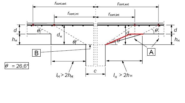 Beträffande måttet c1 så bör det tolkas som avståndet mellan plattans kant och pelarens innerkant. Detta stämmer med definitionen i ekvation (6.41) om pelaren står kant i kant med plattan. Det ger rimligt resultat även om pelaren står innanför kanten, eller om den sticker utanför kanten (i figur 9.9 a) bör c1 alltså motsvara måttet y, inte cy).